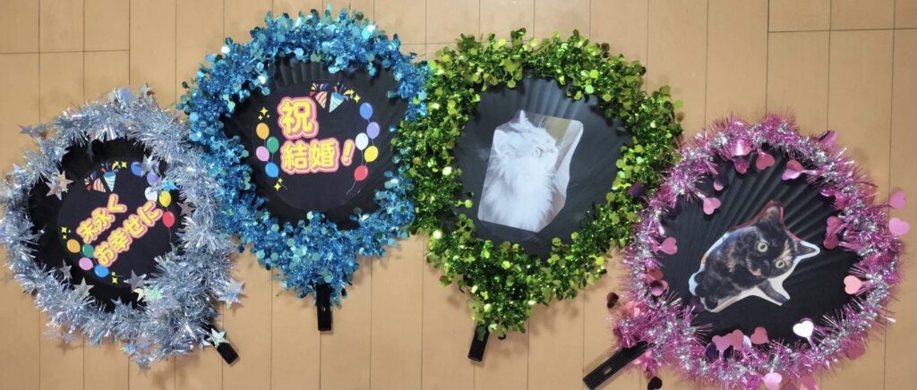 せっかくなので、うちわにメッセージを書いて、飼い猫を印刷してうちわに貼り推し活風に仕上げました。