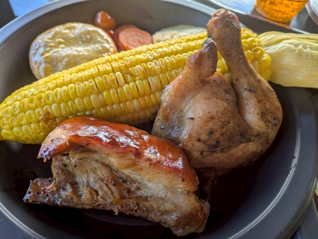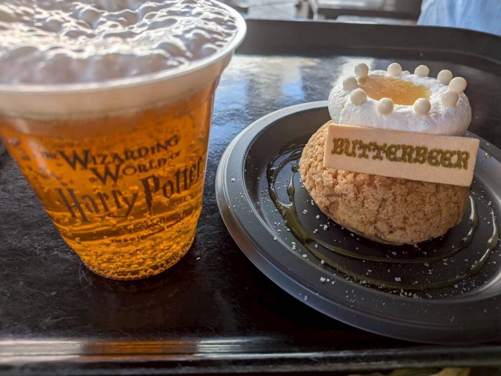 お昼は「三本の箒」でランチ。映画に出てくる料理を再現したメニューで、トウモロコシ丸ごと1本やお肉、ミートパイなどをいただきました。バタービールとバタービールシュークリームで、ささやかなお祝いも。